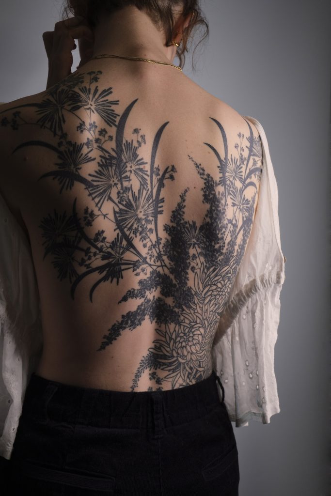 Travaillant surtout à la commande, j’aime réaliser des tatouages sur-mesure qui mettent en valeur le corps des tatoués.